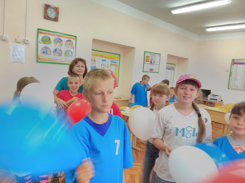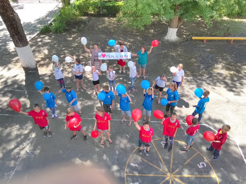 На центральной площадке школьного двора воспитанники лагеря на флешмобе «Я люблю Россию!» исполнили Гимн России. Свою ноту вместе с детьми исполнили педагоги: Крикуненко Алла Николаевна, директор школы, Титаренко Ольга Александровна, директор ЛДПД, Орлова Дарья Сергеевна, Ермакова Любовь Николаевна – воспитатели.