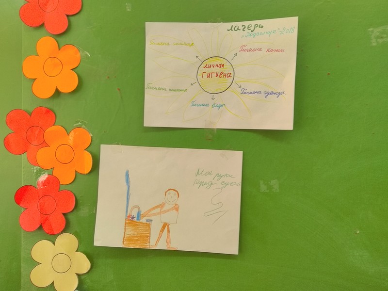 Рисунки «В гостях у МОЙДОДЫРА» разместили на информационной доске в группе отряда «Непоседы».