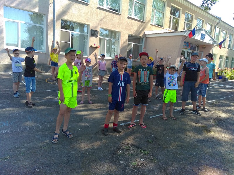 Воспитатели Ермакова Л.Н. и Маслова Е.Н. организовали утреннюю зарядку на школьном дворе. Звучит музыка, развеваются флажки. День праздничный.