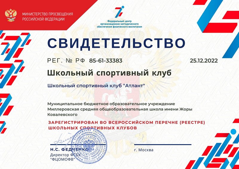 В МБОУ Миллеровской СОШ им. Жоры Ковалевского создан школьный спортивный клуб «Атлант». ШСК «Атлант» имеет Устав, работает согласно Плану работы на учебный год. Были подготовлены документы и написано заявление о внесении нашего клуба во Всероссийский реестр ШСК.