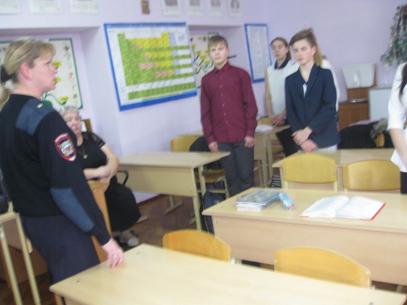 Встреча-беседа учащихся 8, 10 классов с Волковой Ю.В. была проведена в кабинете биологии в конце учебного дня. Были рассмотрены ситуации по проблеме предотвращения грубых нарушений норм поведения в школе и общественных местах, о запрете детям устраивать игры с петардами, о запрете пребывания подросткам в общественных местах до 22 часов.
