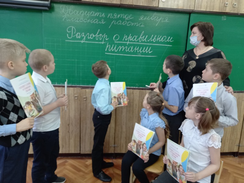 Классные руководители 1-11 классов проводят занятия, тематические часы общения. Школьная библиотека получила книги-блокноты «Разговор о правильном питании», «Формула здорового питания».