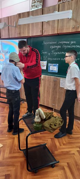 Тему урока – «Безопасность человека при ЧС социального характера» - довели до внимания учащихся 5-11 классов и раскрыли на практических примерах педагоги: Титаренко О.А., заместитель директора по ВР, и Чеботарёв Н.Г., учитель ОБЗР.