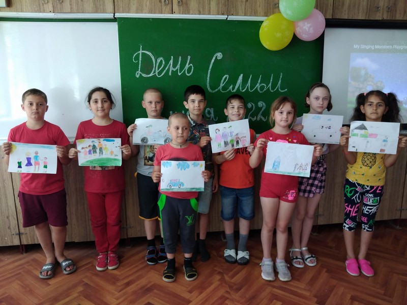 Сегодня день в пришкольном лагере посвящён семье. В каждой группе проведены конкурсы рисунков «Моя семья». Дети рисовали себя и всех членов семьи. Есть рисунки, на которых членом семьи являются и кошки, и даже две коровы. Выставка на витрине «Подсолнух».
