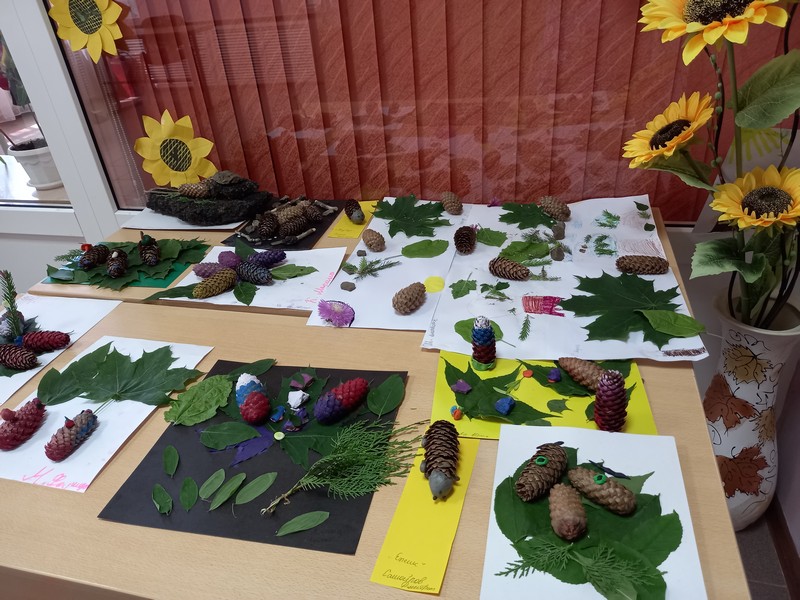 Открылась мастерская по изготовлению поделок из шишек и листьев. Выставка поделок оформлена у витрины «Подсолнух».
