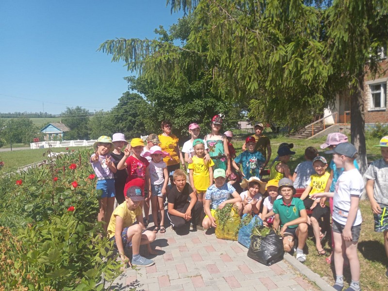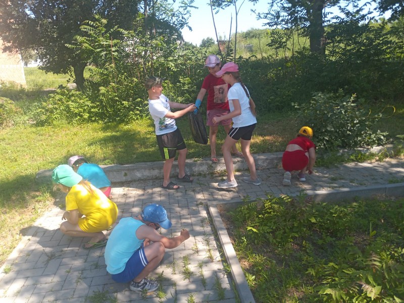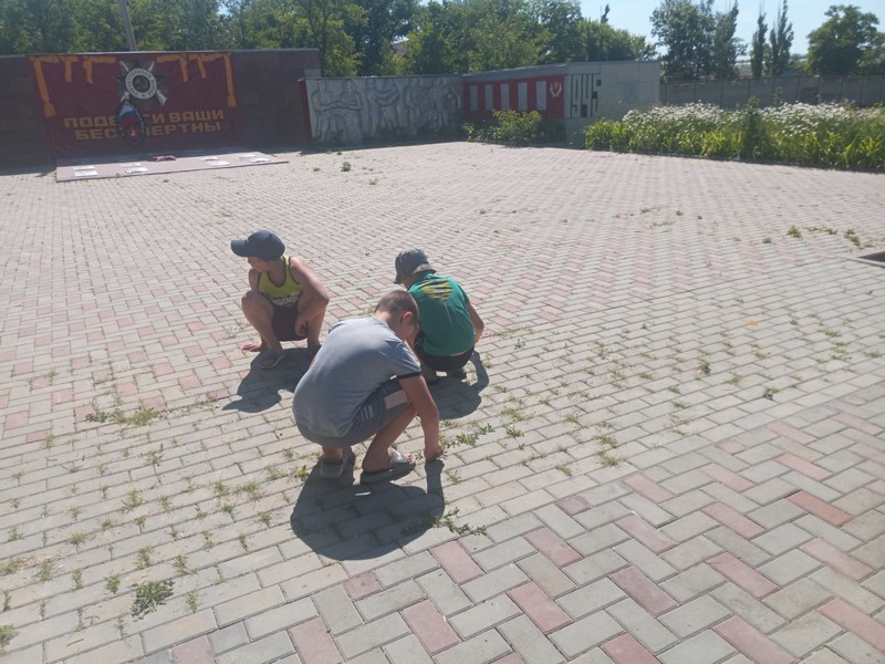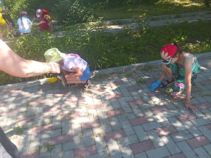 Трудовой экологический десант организован и проведён на территории мемориала. Дети вырвали траву между плиток, вырезали сухие листья и цветы ирисов.