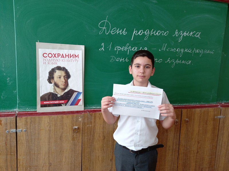 Учителя школы Патюкова Елена Васильевна, Крикуненко Алла Николаевна, Титаренко Ольга Александровна провели тематические вкрапления в свои уроки и беседы, посвящённые Дню родного языка. Даниелян Агарон в 5 классе поделился словами приветствия на армянском языке, Мхитарян Гарник в 8 классе подчеркнул, что в семье отношение к родному языку уважительное. Мхитарян Климик на уроке в 7 классе на армянском языке прочёл стихотворную строфу о языке.