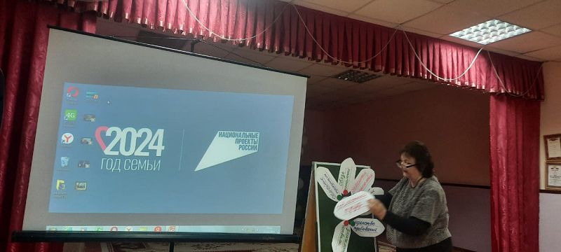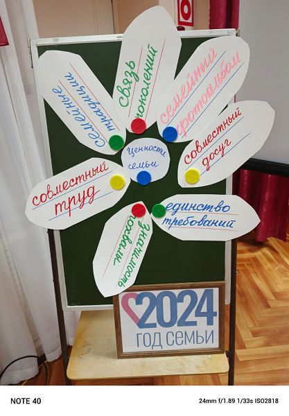 В ходе общения удалось «вырастить» необычный цветок «Семейные ценности». Каждый из семи его лепестков – это названия семейных ценностей, которые служат для счастья и крепости семьи: связь поколений, семейные традиции, семейный фотоальбом, совместный досуг, единство требований отца и матери, значимость похвалы для ребёнка, совместный труд всех членов семьи.
