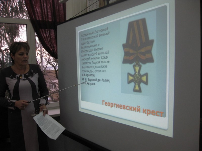 Крикуненко Эллина, ученица 10 класса, победитель районной краеведческой конференции, представила старшеклассникам свой доклад «Герои войны в истории родного края». Куценко Виктория, ученица 10 класса, призер краеведческой конференции, рассказала о земляке –Ольхове Василии Семёновиче, уроженце хутора Антониновка. Это единственный наш земляк, ставший полным кавалером этого почётного солдатского ордена. О значимости этого ордена говорит тот факт, что в 1967 и 1975 годах были введены значимые льготы полным кавалерам ордена Славы, уравнявшие их в правах с Героями Советского Союза.