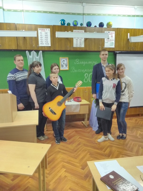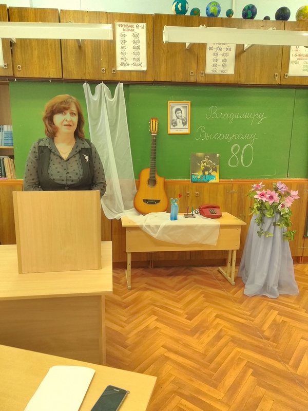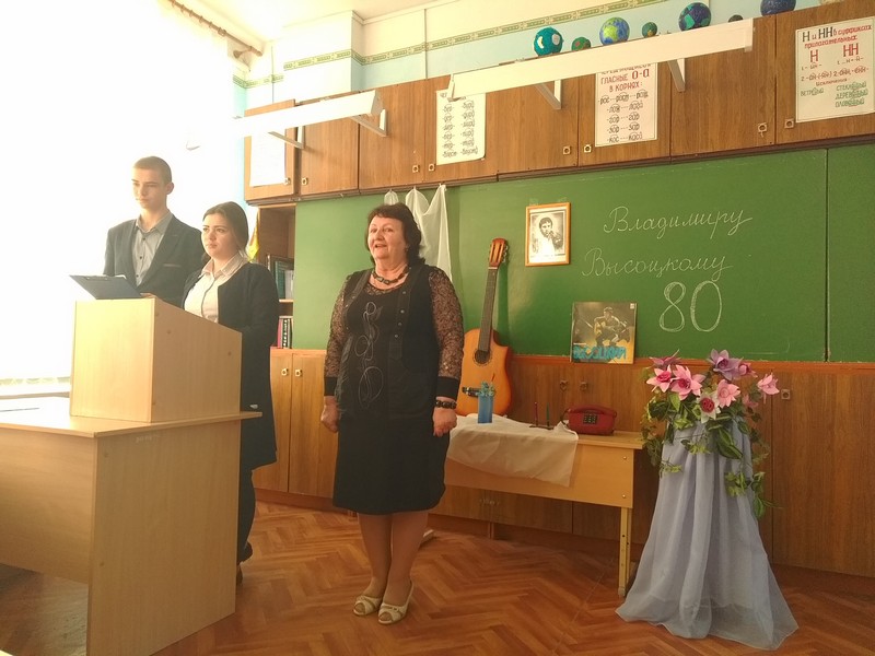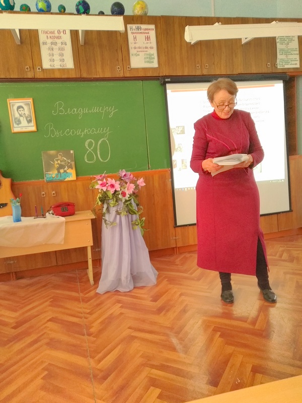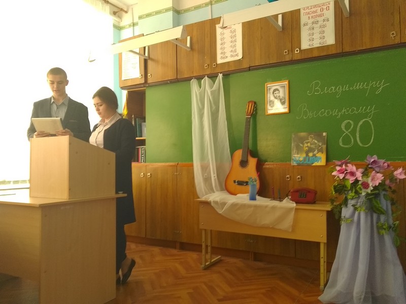 80-летие со дня рождения Владимира Высоцкого старшеклассники отметили в литературной гостиной, которая гостеприимно открыла двери в кабинете русского языка и литературы для всех желающих прикоснуться к знаменитого поэта-барда. О жизни и творчестве в этот вечер рассказали Татарченко Валерия, Чеботарёв Никита, Алисова Ольга, Калачёва Алина, Саакян Артём.