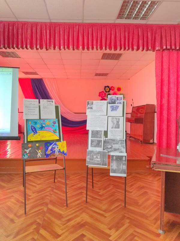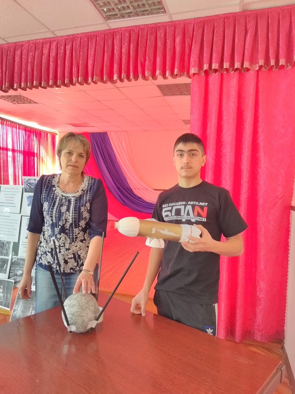В вестибюле выставлены рисунки и поделки, раскрывающие космическую тему. Макеты спутника и космического корабля изготовили учащиеся 9 класса: Даниелян Минас и Татарченко Александр.