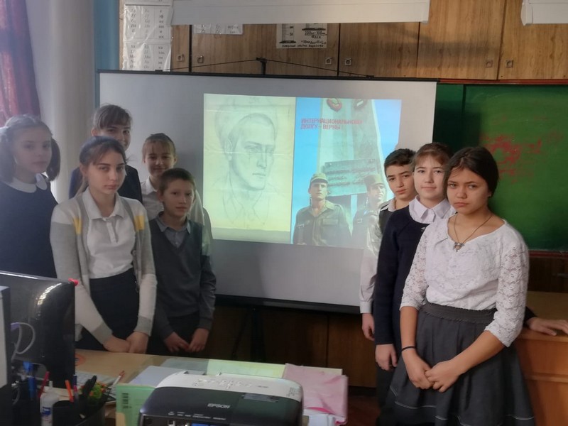 - Мухина Валентина Владимировна, кл. рук. 6 класса, организовала для детей беседу по теме «Портрет героя-афганца», познакомила со своим родным братом Баштура Петром, годы службы которого были в Афганистане.