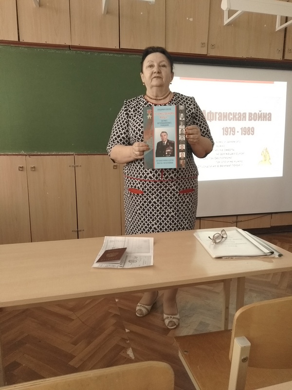 - Титаренко Ольга Александровна, руководитель школьного музея, представила учащимся 7, 9 классов книгу героя Советского Союза, афганца, генерал-лейтенанта Неверова Владимира Лаврентьевича «Автобиография в фактах, цифрах, фотографиях», прочла своё стихотворение «Мысли вслух афганца».