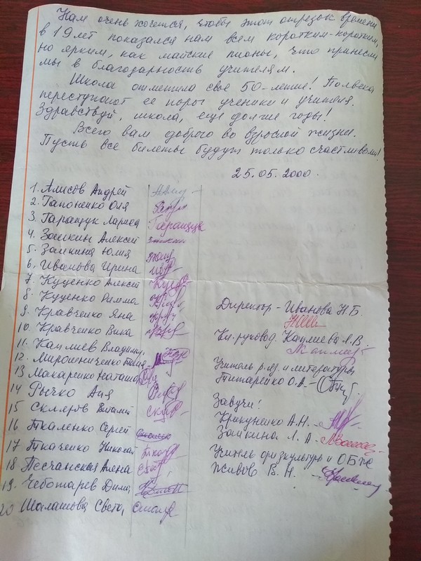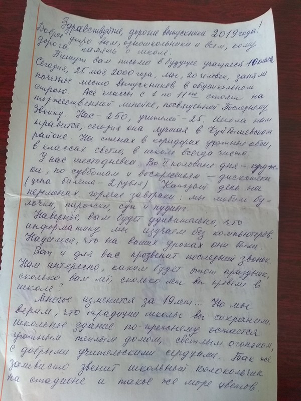 Титаренко Ольга Александровна, как руководитель школьного музея, прочла письмо, написанное учащимися 10 класса в далёком 2000 году. Все эти 19 лет письмо хранилось в стене школьного здания. Накануне в присутствии всей школы Живов Владимир Николаевич достал послание и передал в музей.