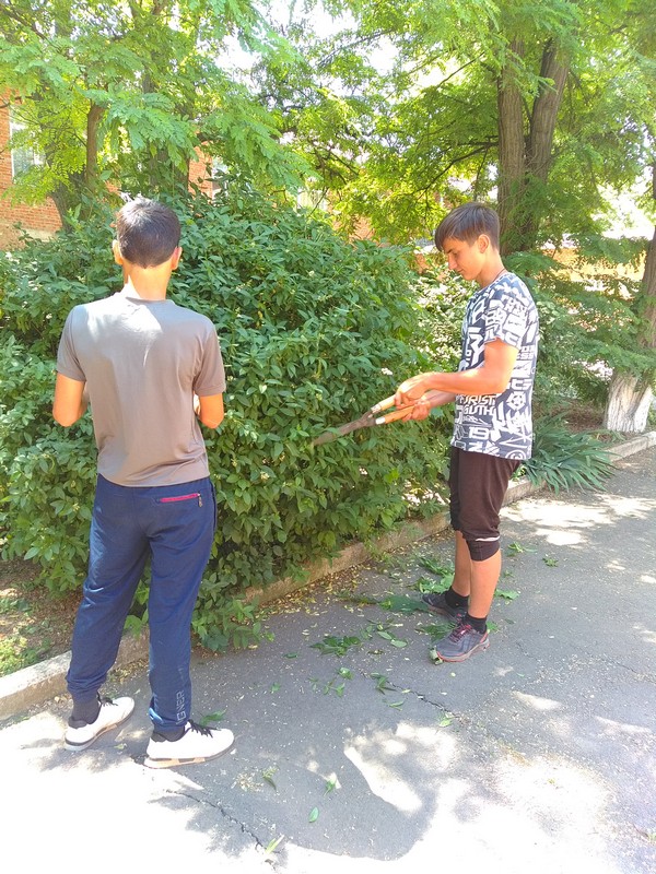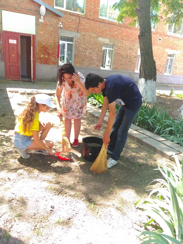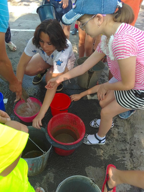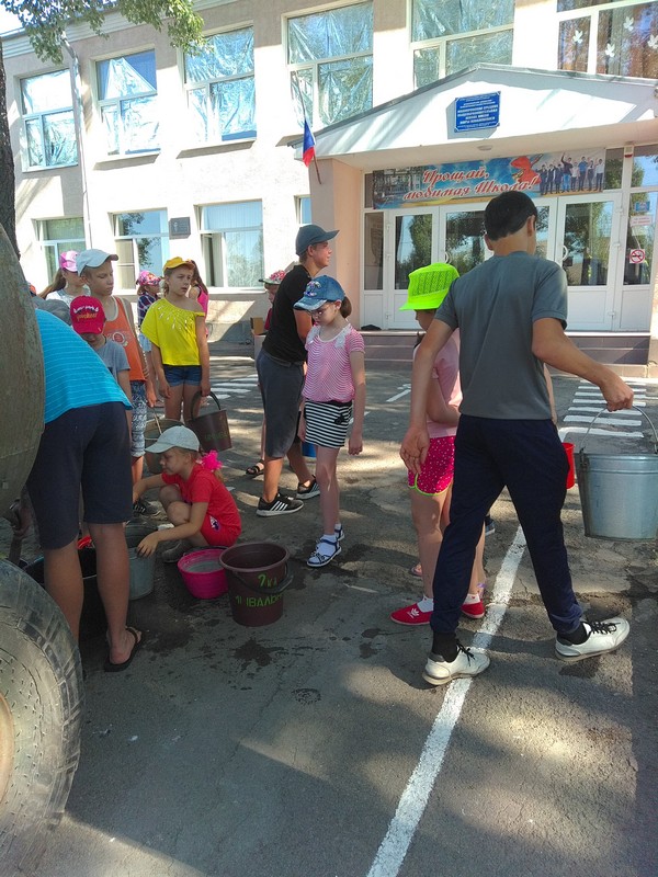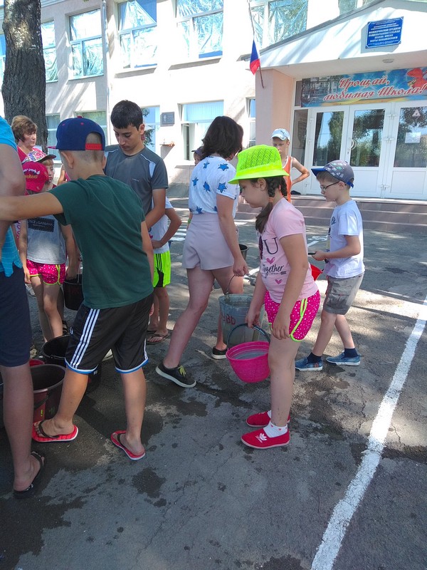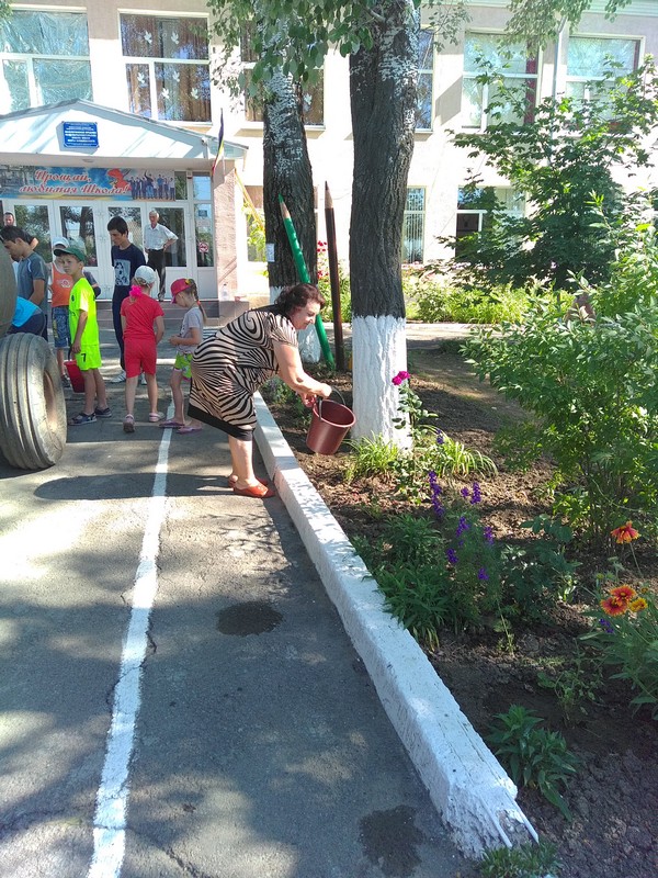 Воспитанники лагеря тщательно полили все цветы и саженцы высаженных весной деревьев на школьном дворе.