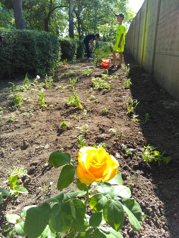 Учащиеся 8 класса под руководством Куценко Л.В., кл. руководителя, высадили рассаду цветов: ирисы, петунья на клумбах школьного двора.