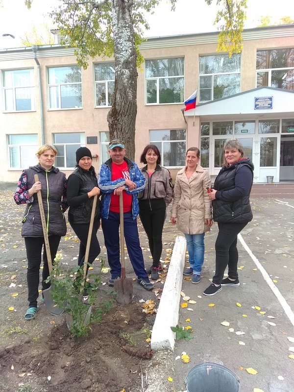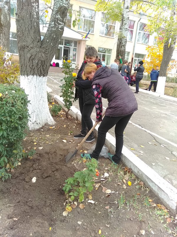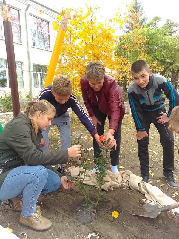 В этот день цветочные клумбы на школьном дворе пополнились 10 кустами роз. Приобрели саженцы родительские комитеты классов.