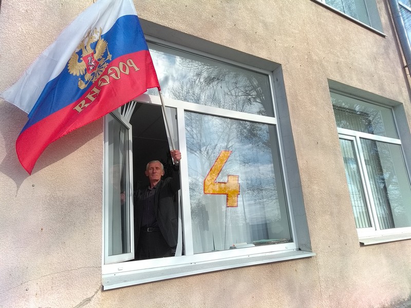 Маленькие группы участников флешмоба готовились к митингу в своих классных комнатах. По сигналу общего сбора все собрались на школьном дворе со своими атрибутами праздника.