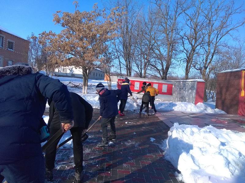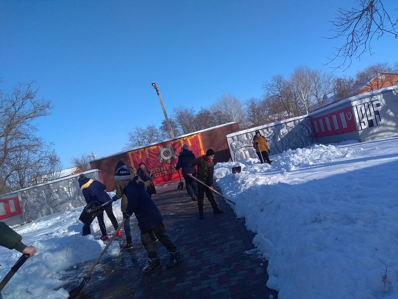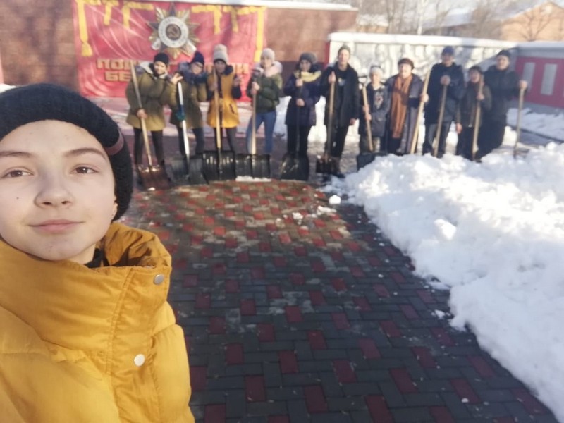 Волонтёры школы – 12 добровольцев – приняли участие в уборке снега на мемориале: расчистили дополнительные «карманы» у мемориальных плит «Подвиги ващи бессмертны».