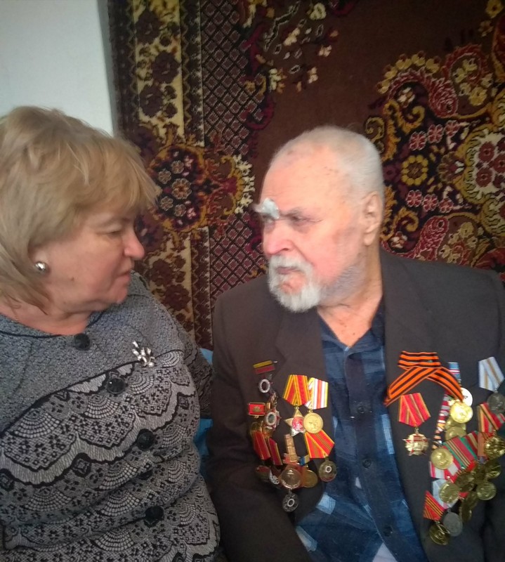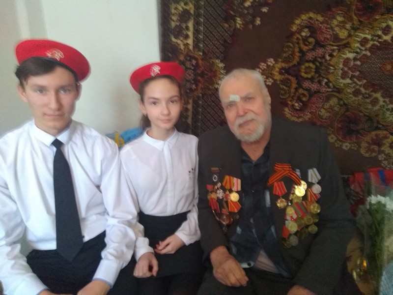 Титаренко Ольга Александровна, заместитель директора по воспитательной работе, Крикуненко Полина и Аленичев Даниил, члены школьного отряда «Юнармия», поздравили фронтовика с вручением юбилейной медали: прочли стихи, вручили цветы и Благодарственное письмо от молодого поколения 21 века.