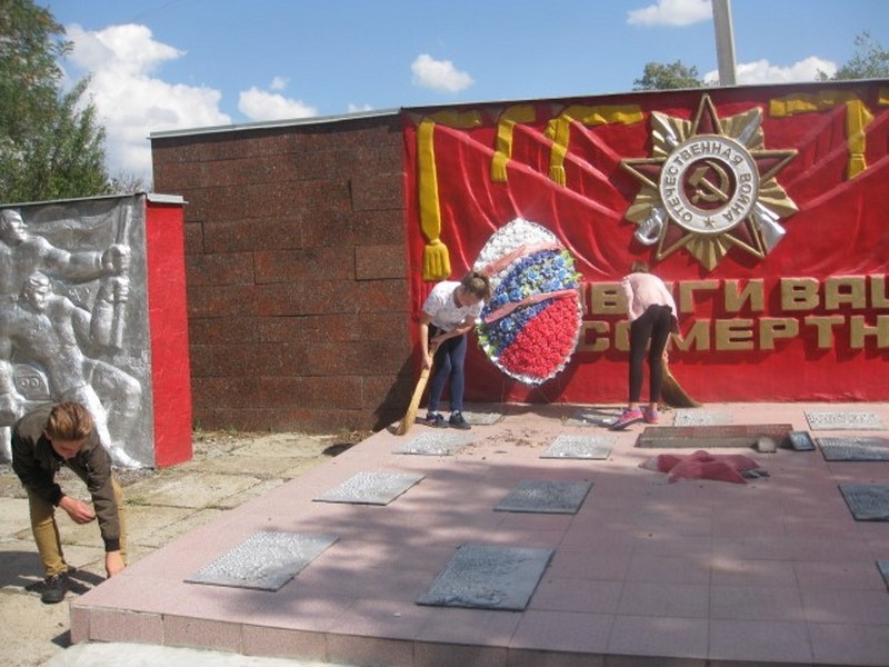 В День добрых дней на мемориале в центре села Миллерово провели уборку волонтеры - учащиеся 8 класса: Даниил, Владислав, Сергей, Александр, Юлия и Дарья и педагоги: Каплиева Л.В., кл. рук. 8 класса и Титаренко О.А., руководитель школьного музея «Родная старина».